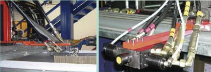 聚氨酯組分原料經過連續(xù)高壓發泡機的計量泵精密計量後,按照一定配比,被送入混合頭均勻地布料在複合板的底層麵材上,並和上(shàng)層麵材同時被送入雙履帶(dài)層壓輸送機,聚氨酯泡沫在(zài)雙履帶層壓(yā)輸送機的上下輸送鏈板間發泡(pào),並固定成型。待固(gù)定(dìng)成(chéng)型後,複(fù)合板在生產線上被自動跟蹤,切斷(duàn)機按需切成一定長度(dù)的成品。